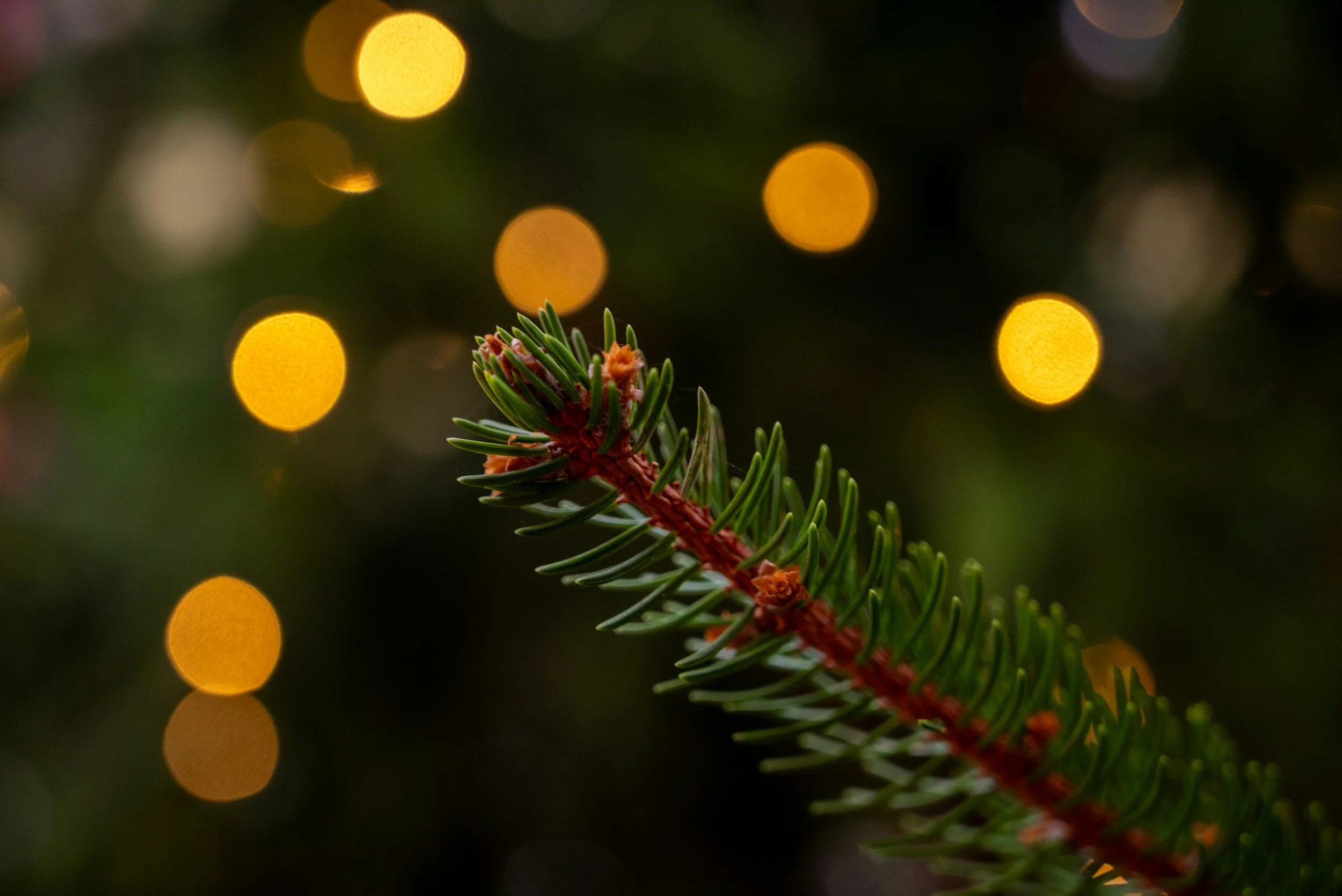 A single pine branch in front of holiday lights.